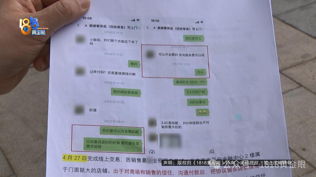 小赵:跟我们发微信说,我们找到客户了,一万五愿意回收。我们非常强烈地拒绝,因为跟七折回收有很大差距,大概两千块的价差,我们要求七折回收,并且开正规发票。第三轮就是我们回到公司,下午两点多,又给我们发消息,我们找到客户了,你把衣服拿过来。我们又过来了,让我们把衣服留在店里,但是不能保证什么时候打款,打多少钱。