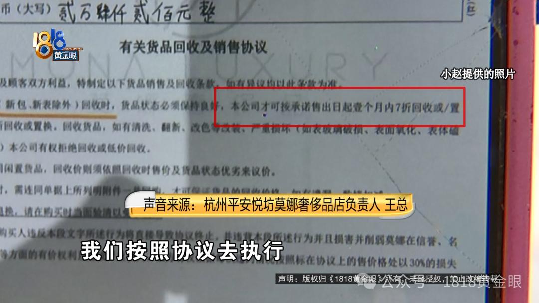 杭州平安悦坊莫娜奢侈品店负责人 王总:一式两份的,事实是这个小伙子已经离职了,可能没有把这个事情交接清楚,中间产生了一些误解。早上店员跟我沟通,说小姐姐对我们的回收流程有疑问,没有签协议。现在我们就是,当初已经答应,包括销售协议上已经注明的,我们按照协议去执行,这个没有问题。