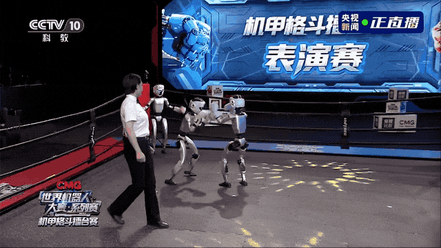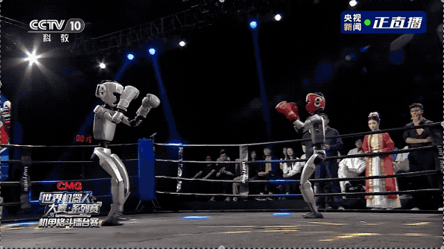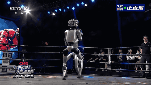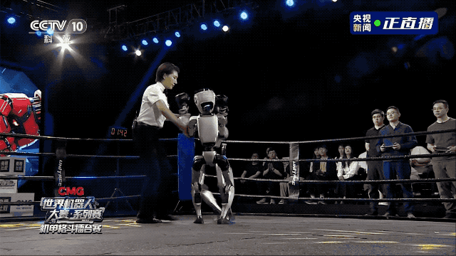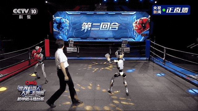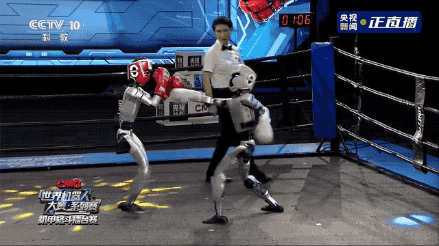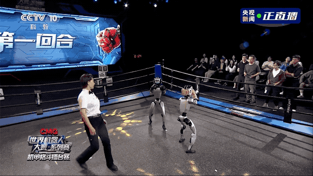 比较遗憾的是,导播在关键时刻切了镜头,错过了机器人版“鲤鱼打挺”。接着便是正赛,而在正式开始之前,先简单说下比赛规则。竞技赛采用标准的三回合赛制,每回合两分钟。击中头部或躯干算有效击打,倒地要扣分,若倒地后无法在规定时间内起身,则判负。三轮结束后,累计得分最高者获胜。别看是机器人,但它们的招式一点也不含糊:直拳、勾拳、扫腿、侧踢……整整十种动作组合,打起来有板有眼。打得像人、摔得更像人,这场机器人擂台赛有点东西第一场:小黑VS小粉首场登场的是小黑和小粉,正式展开较量。双方人类操作员念完狠话,握手示意,接着一声令下,两台机器人瞬间启动,开局互踹,战意拉满,但打着打着也有些“迷路”。