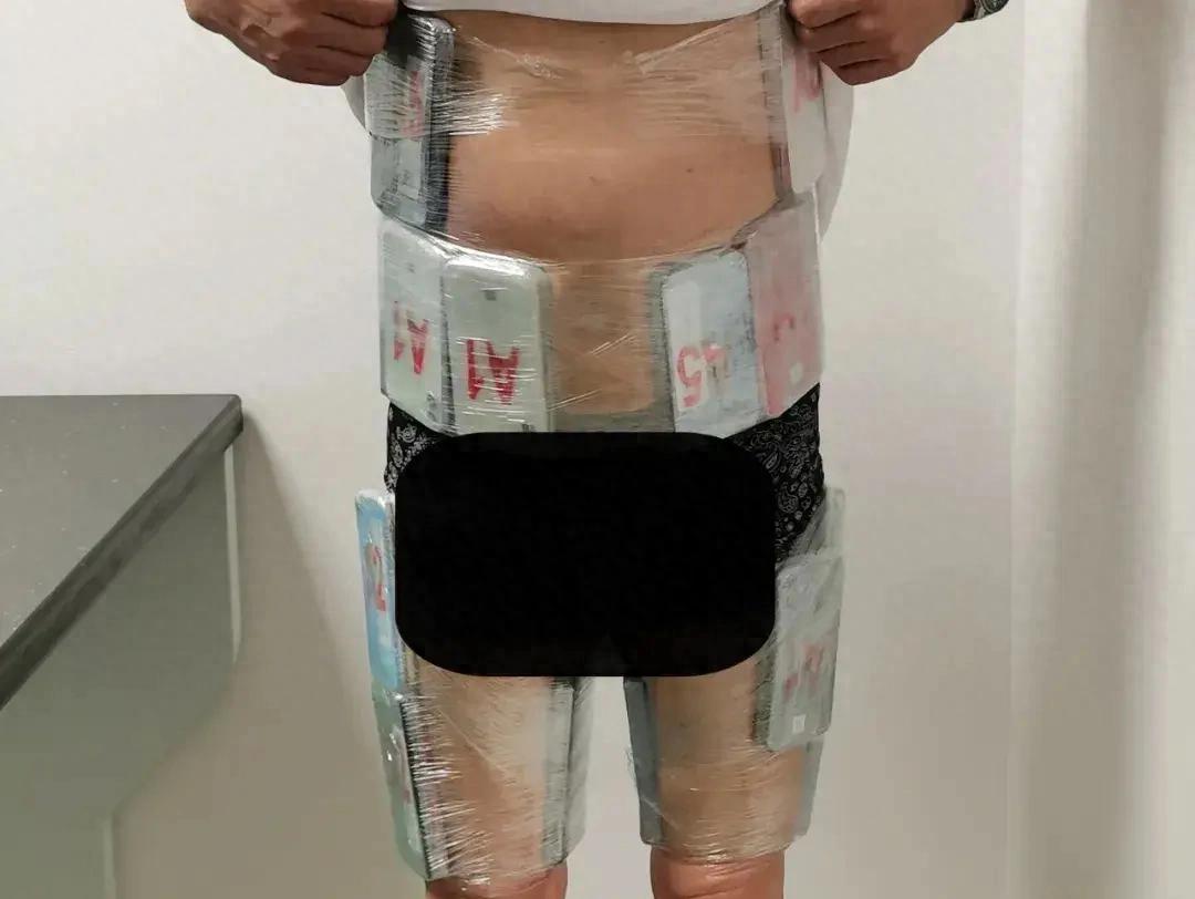 经进一步检查,关员在该名旅客肋部、腰腹部及大腿两侧发现用塑料膜捆绑的旧手机共计52台。