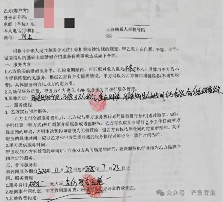 近日,济南市民王女士(化名)向齐鲁晚报·齐鲁壹点反映,其与次第花开婚姻服务有限公司签订一份价值10001元的婚介服务合同后,遭遇服务严重缩水及公司失联等问题,1万余元服务费面临“打水漂”风险。