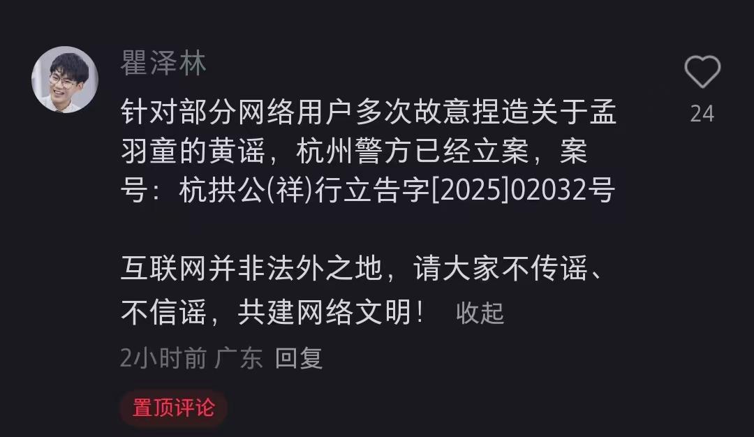 5月26日,律师瞿泽林在孟羽童的评论区留言,“针对部分网络用户多次故意捏造关于孟羽童的黄谣,杭州警方已经立案,案号:杭拱公(祥)行立告字(2025)02032号。互联网并非法外之地,请大家不传谣、不信谣,共建网络文明!”目前,该条评论在孟羽童的评论区里已置顶。