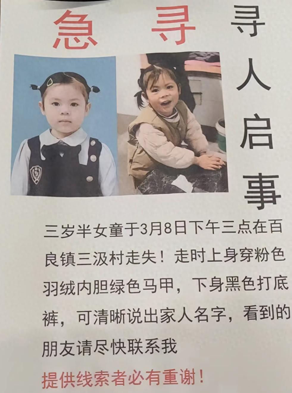 潇湘晨报此前报道,2024年3月8日下午3时许,陕西渭南合阳县百良镇三汲村3岁半女童曹乐琪在家门口走失。据家属发布的寻人启事,曹乐琪走失前身着粉色羽绒内胆绿色马甲,下身穿黑色打底裤,可清晰说出家人名字。