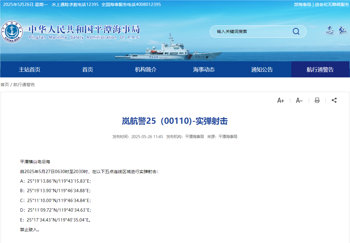 自2025年5月27日0630时至2030时,在以下五点连线区域进行实弹射击: