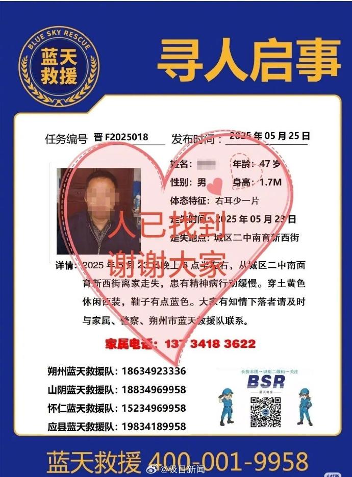 5月25日,有网友发帖称,山西朔州一名患有精神疾病的男子走失了。26日,极目新闻记者获悉,当天上午8时许,走失人员已被当地蓝天救援队志愿者找到。