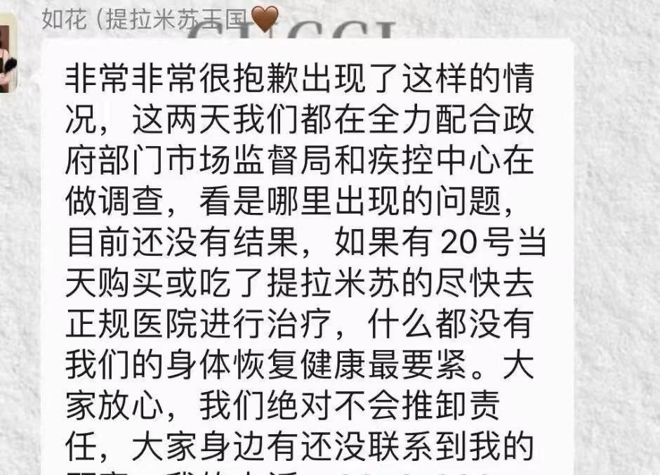 从网传消费者提供的截图显示,涉事商家在群中致歉,表示在全力配合政府部门市场监督局和疾控中心做调查,并建议5月20日当天购买或食用提拉米苏的消费者尽快去正规医院进行治疗。目前,该商家的社交媒体账号已设置为私密状态。