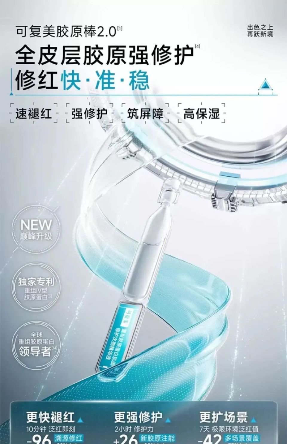 记者留意到,此次被公开质疑的是 “可复美胶原棒”是可复美的明星产品,主打重组胶原蛋白成分,宣称具有修护肌肤、提升肌肤弹性等功效,在市场上颇受消费者欢迎,售价为439元/盒(规格为1.5ml×30支)。2024 年,该产品入选天猫金妆奖年度抗老精华产品。