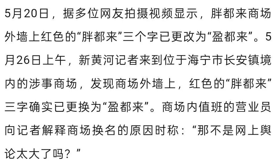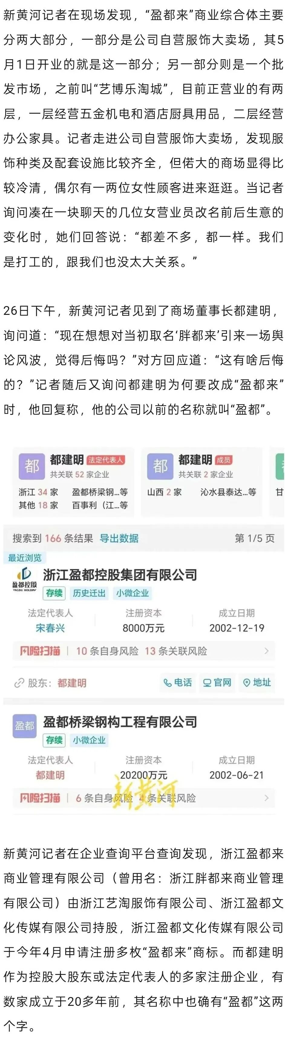 近期,因取名引发争议的“胖都来”已改名为“盈都来”,再度引发网友热议。为何会改为这个名字?5月26日,“盈都来”商场董事长都建明回应新黄河记者称,因为他的公司以前的名称就叫“盈都公司”。当记者问及对此前因取名“胖都来”引发舆论风波一事是否后悔时,都建明回应道:“这有啥后悔的?”