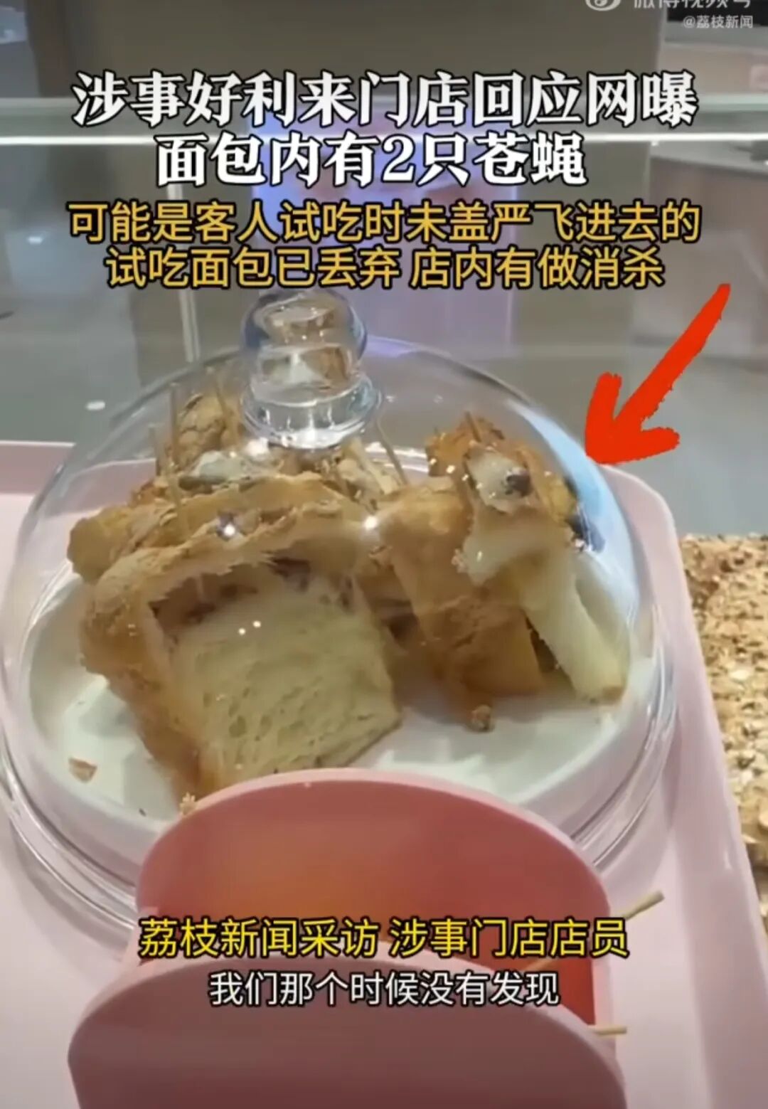 涉事门店店员回应记者表示,可能是客人试吃时盖子没有盖严,导致苍蝇飞进去,发现后已把试吃面包扔了,店内有做消杀。