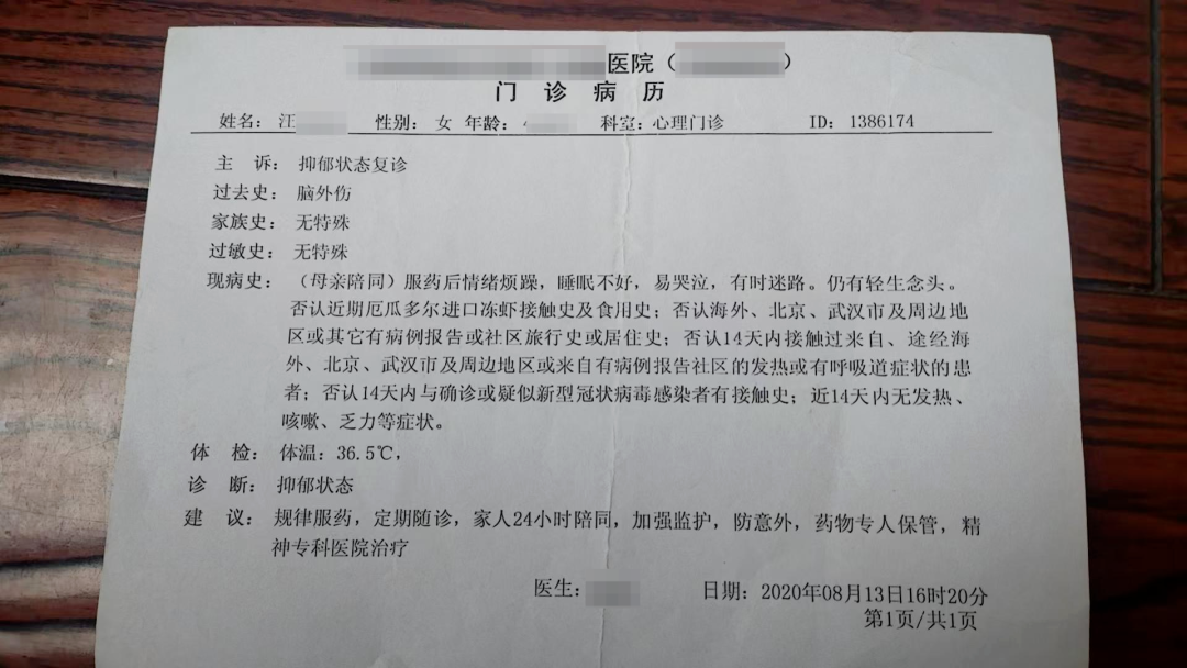 汪女士在一家医院的病历显示,诊断为抑郁状态,还有另外一家医院的检查结果显示“肺部有磨玻璃结节”。