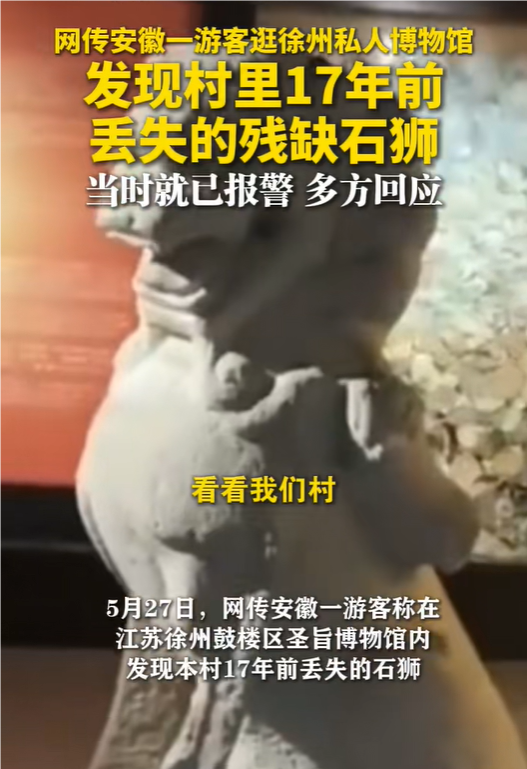 5月27日,江苏徐州。据百姓关注报道,安徽一游客称在徐州鼓楼区圣旨博物馆内发现本村17年前丢失的石狮。该网友称,这座有残缺的石狮来自宿州萧县,当年丢失的时候就已经报警。27日,记者致电鼓楼区文旅局询问此事,对方称正在了解石狮来源。17时许,圣旨博物馆回应已接到游客反映,目前工作人员正在核实。另据荔枝新闻报道,徐州市民政局回应称,圣旨博物馆在本局注册属实,业务主管单位是市文化广电和旅游局。