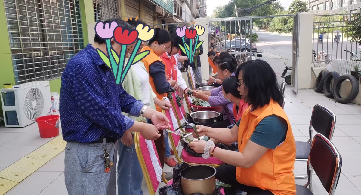 随后,大家一起准备糯米、红枣、粽叶等包粽子的材料,邀请擅长包粽子的志愿者示范“折叶-填馅-捆绑”技巧,参与者分组尝试,互帮互助。尽管部分粽子造型“不拘一格”,但大家在动手过程中体验了传统手艺的乐趣,现场飘满粽叶清香。