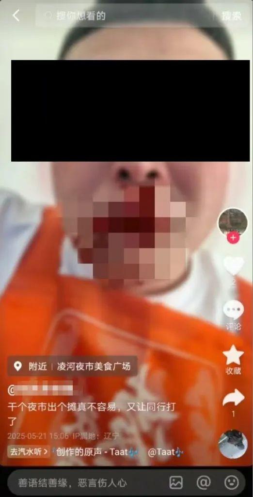 近日,一名在辽宁省锦州市凌河夜市从业的男子在某视频平台上发布了自己被“打”得口鼻流血的视频,并配以文字“干个夜市出个摊真不容易,又让同行打了”。