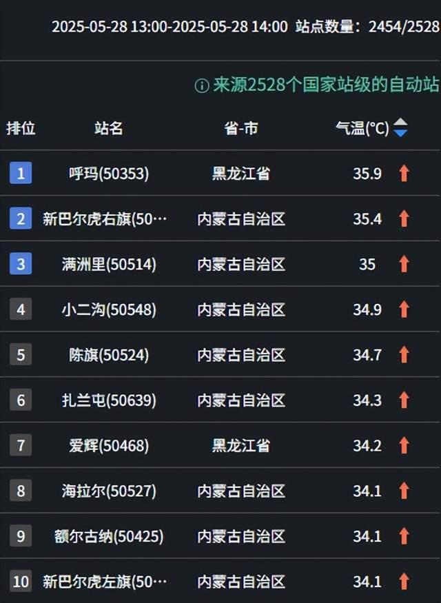 今天的气温榜真的给人一种错乱感。黑龙江呼玛、爱辉,内蒙古新巴尔虎右旗、海拉尔、满洲里…这好几个冬天低温榜的“常客”,却成了今天全国最热的地方。