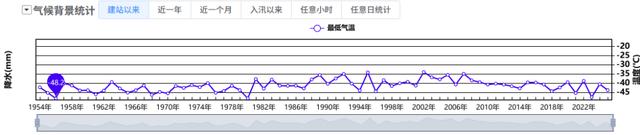 ↑ 黑龙江呼玛建站以来逐年最低气温,-40℃并不少见,其中-48.2℃为当地最低气温极值纪录。