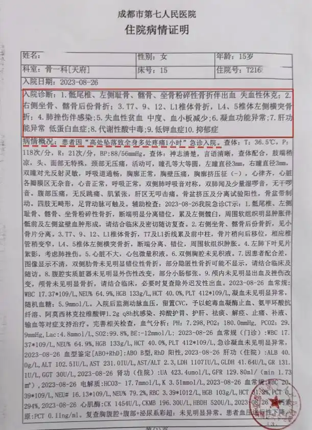 丹丹坠楼送医后被检查出全身多处骨折。 受访者供图