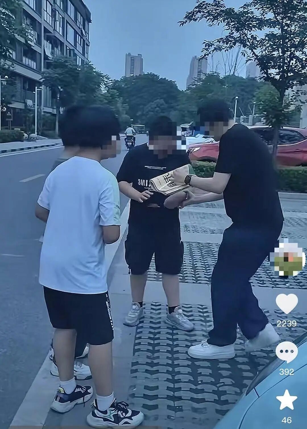 ▲家长带着孩子道歉时,王先生给孩子们送去了试卷。图据涉事人员的社交账号视频截图