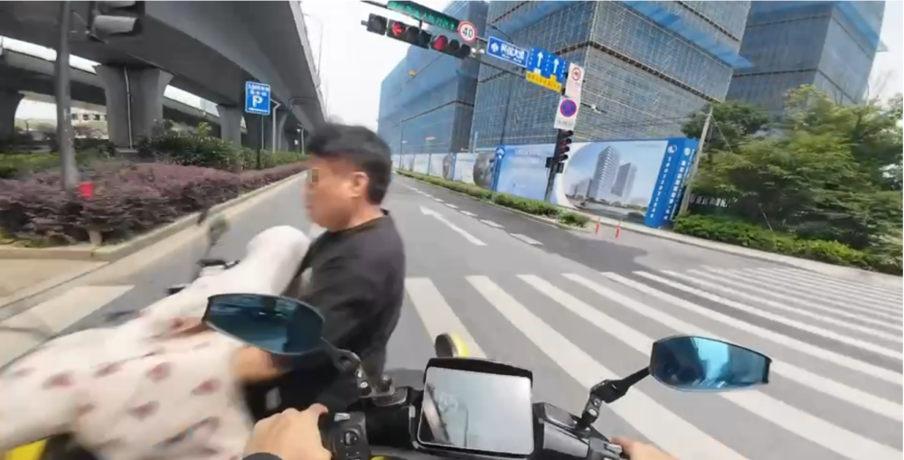 超速电摩车主起身后大声说“红灯,红灯,我录着呢”,随即走向自己的电摩,车辆疑似没有牌照。