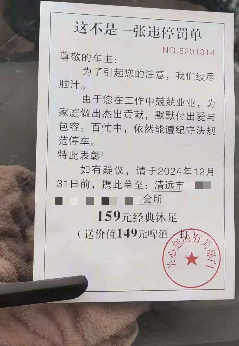 近日,“惊吓式”营销在网络上“意外走红”——商家将小广告伪装成交警违停罚单,张贴于车辆前挡风玻璃上,远观几可乱真。此类广告多以KTV、健身房、家具促销等内容为主,引发网友关注。