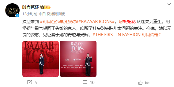 5月28日,杨妞花亮相时尚芭莎年度派对。@时尚芭莎官方发文:杨妞花从迷失到重生,用坚韧与勇气找回了失散的家人,唤醒了社会对失踪儿童问题的关注。活动当晚,她以无畏的姿态,见证属于她的奇迹与光辉。