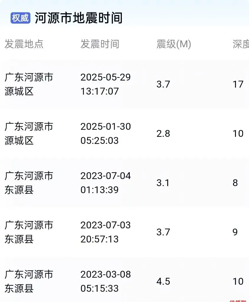 据了解,广东河源市位于河源-邵武断裂带,地震活动频繁。近10年发生多次3级以上地震,2023年2月11日10时41分,该市源城区发生的4.3级地震为近5年来河源市区最大震级。此外,河源市区历史上还发生过其他较大地震,如:1962年3月19日,河源发生了6.1级地震,这是河源历史上最强烈的地震之一,此次地震还造成了广泛的破坏;2013年2月22日,河源发生了4.8级地震,震感强烈,影响了周边多个城市;2023年3月8日,河源东源再次发生4.5级地震,成为当年广东地区最大的一次地震。