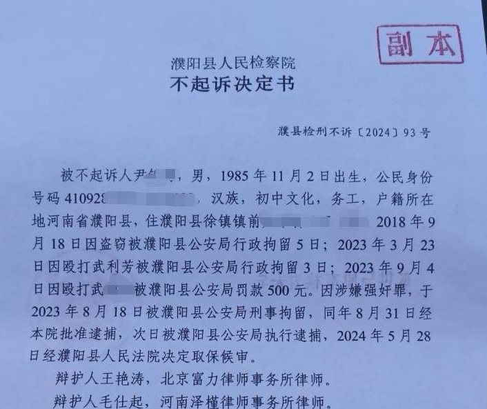 去年7月31日,濮阳县检察院认为本案现有证据不足,达不到起诉条件,作出不起诉决定书。