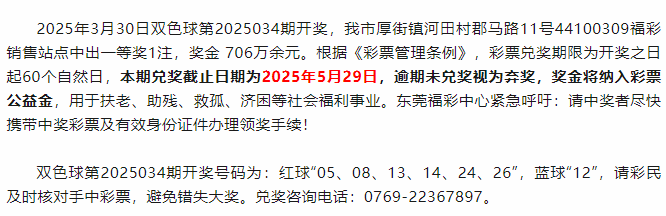 东莞福彩此前发文表示,根据《彩票管理条例》,彩票兑奖期限为开奖之日起60个自然日,本期兑奖截止日期为2025年5月29日,逾期未兑奖视为弃奖,奖金将纳入彩票公益金,用于扶老、助残、救孤、济困等社会福利事业。