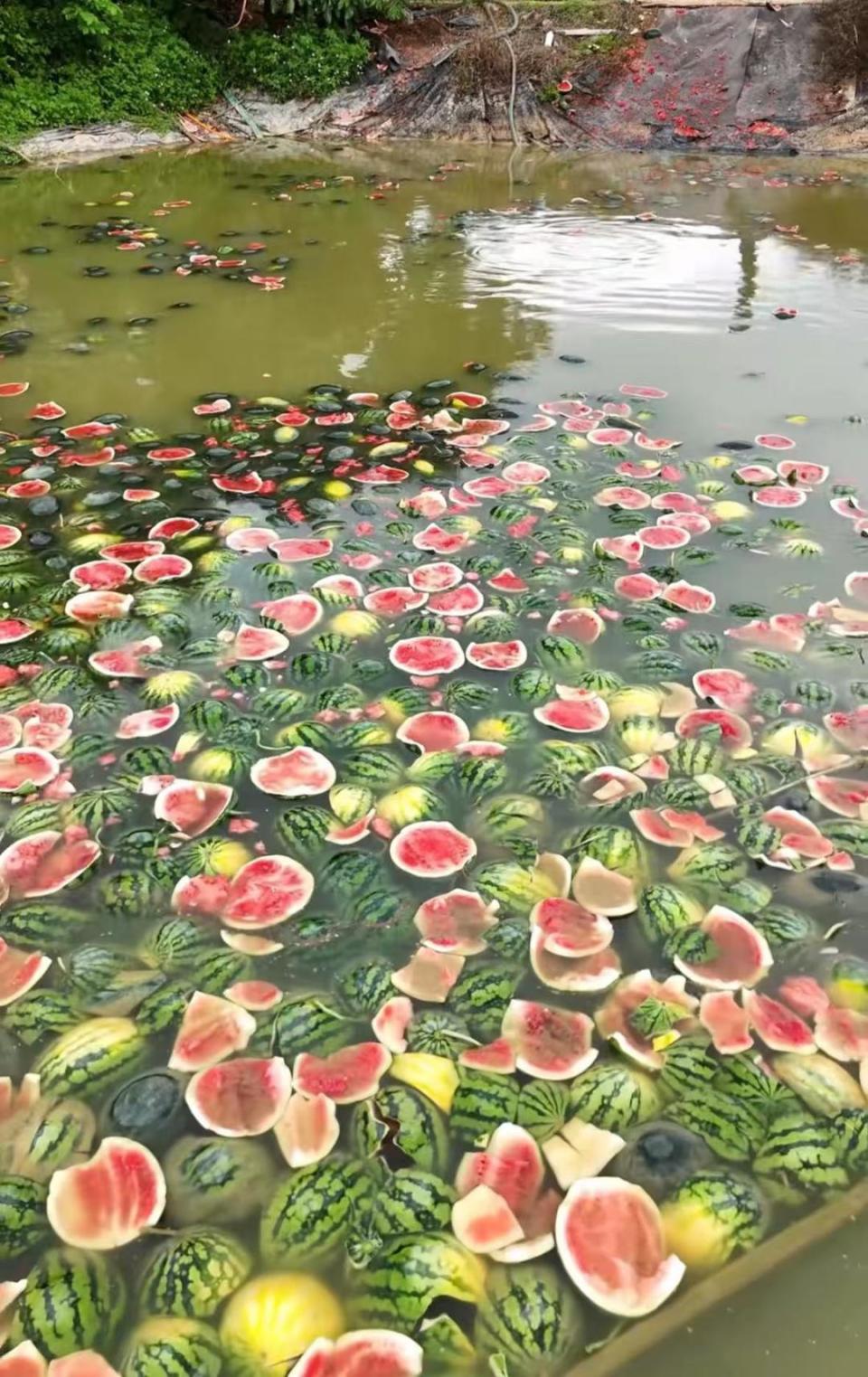 ▲网传视频中,有果农将西瓜扔进池塘喂鱼
