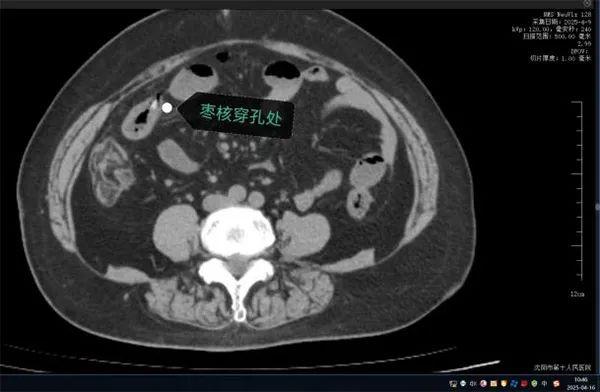 家属回忆,当天上午康阿姨吃粽子时误吞两颗枣核。医生会诊判断枣核尖端已刺穿小肠,紧急手术取出异物。
