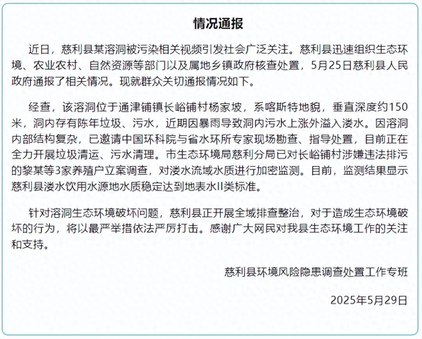 慈利发布的通报显示,针对溶洞生态环境破坏问题,慈利县正开展全域排查整治,对于造成生态环境破坏的行为,将以最严举措依法严厉打击。