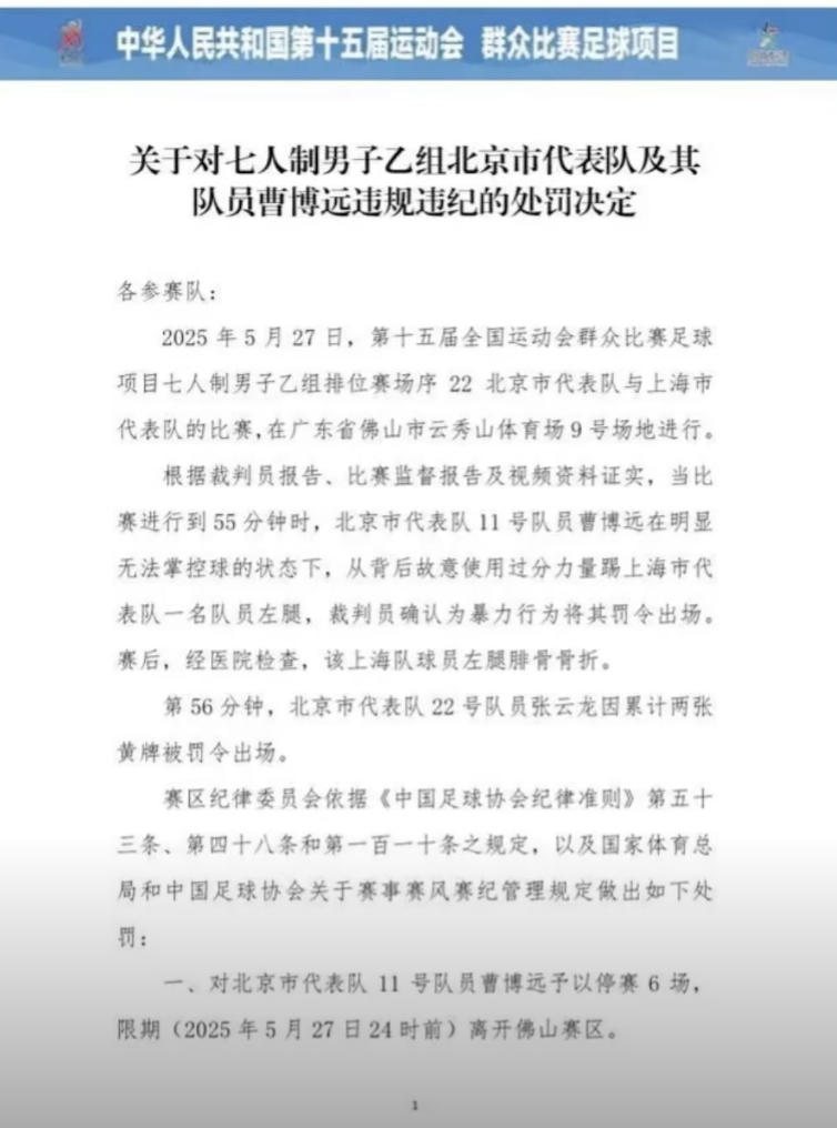 有消息称,第十五届全国运动会(下称十五运会)开出重磅罚单。七人制男子足球比赛过程中,北京代表队足球运动员曹某某因恶意踢上海队球员,致使对方左腿骨折,被罚停赛6场,并限期离开佛山赛区。