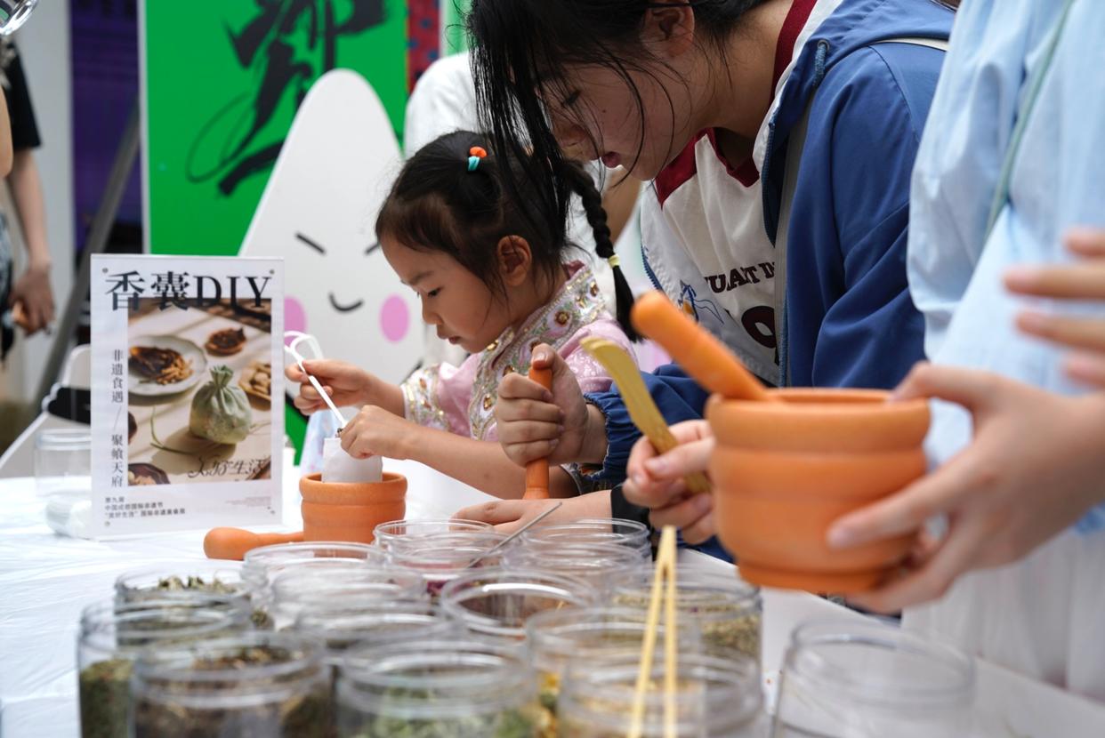 值得一提的是,国际非遗美食周还特别设置了端午主题活动,现场展示并可品尝各地不同口味、不同包法的粽子20余种。市民及游客还可以参与制作艾草香囊、编织五彩绳等端午民俗体验活动。