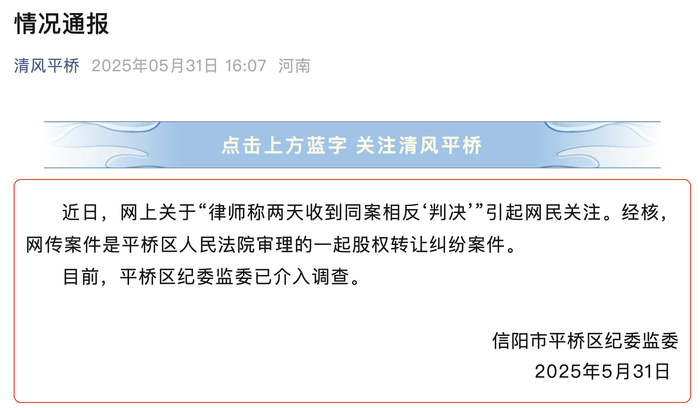 5月31日,河南信阳市平桥区纪委监委发布情况通报:近日,网上关于“律师称两天收到同案相反‘判决’”引起网民关注。经核,网传案件是平桥区人民法院审理的一起股权转让纠纷案件。目前,平桥区纪委监委已介入调查。