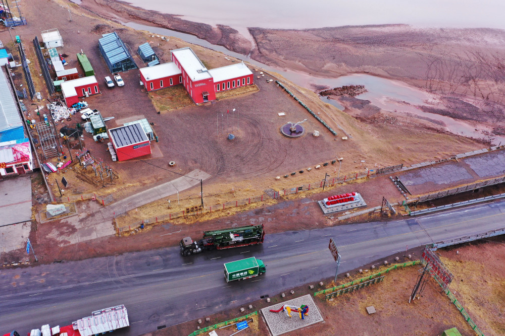 5月29日,装完垃圾的邮车驶离长江源水生态环境保护站(无人机照片)。新华社记者 陈杰 摄