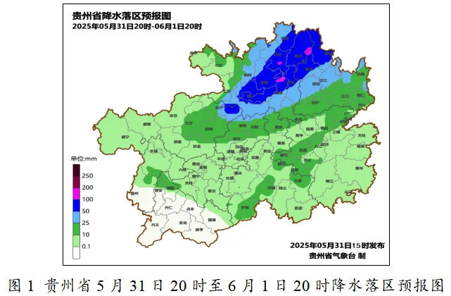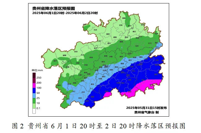 据气象预报,5月31日至6月2日贵州省将出现强降雨天气过程。其中5月31日夜间到6月1日白天,遵义、铜仁、贵阳北部、毕节东北部有中到大雨,部分乡镇有暴雨,个别乡镇有大暴雨, 并伴有短时强降水和雷暴大风等强对流天气;6月1日夜间到2日白天,贵阳南部、铜仁东南部、黔东南、黔南中南部、安顺南部、黔西南、六盘水南部有中到大雨,并伴有短时强降水和雷暴大风等强对流天气,其中铜仁东南部、黔东南大部、黔南中南部、安顺南部、黔西南东南部局地有暴雨,黔东南南部和黔南南部个别乡镇有大暴雨。