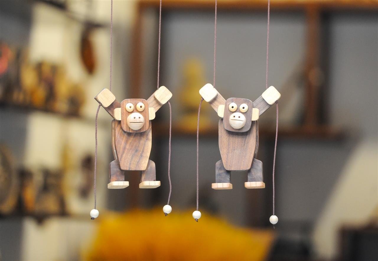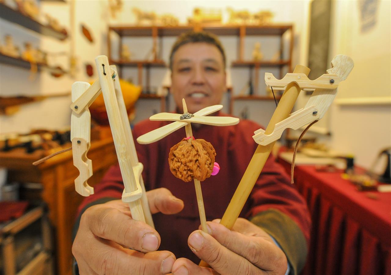 “这个核桃车跟电影《一九四二》里那个小女孩玩的一样,也都是我们小时候玩的,这个翻猴是利用杆杠原理制作的。”徐女士笑着说,在丈夫的影响下,自己也学会了老玩具的制作。