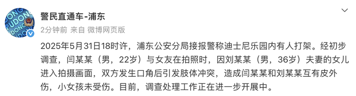 日前,上海迪士尼度假区内一对情侣和一对带孩子的夫妇发生纠纷的视频引发网友关注。6月1日晚,@警民直通车-浦东 微博通报,5月31日18时许,浦东公安分局接报警称迪士尼乐园内有人打架。经初步调查,闫某某(男,22岁)与女友在拍照时,因刘某某(男,36岁)夫妻的女儿进入拍摄画面,双方发生口角后引发肢体冲突,造成闫某某和刘某某互有皮外伤,小女孩未受伤。目前,调查处理工作正在进一步开展中。