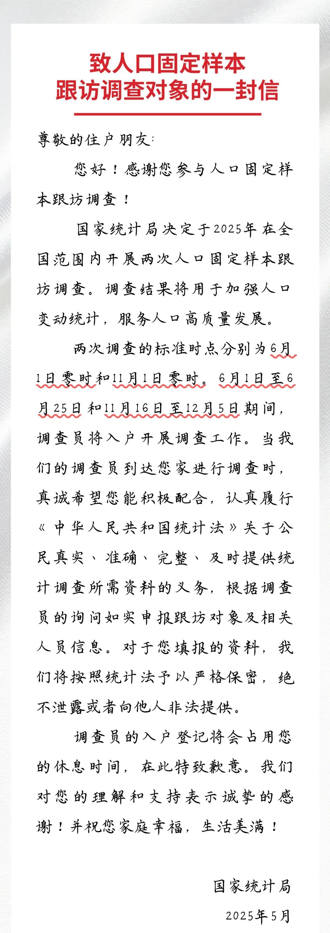 据了解,今年的人口固定样本跟访调查将在6月1日与11月1日各开展一次,调查以第七次全国人口普查结果为基础,共计抽取了30万人样本,在6月份调查20万人,11月份调查剩余10万人。