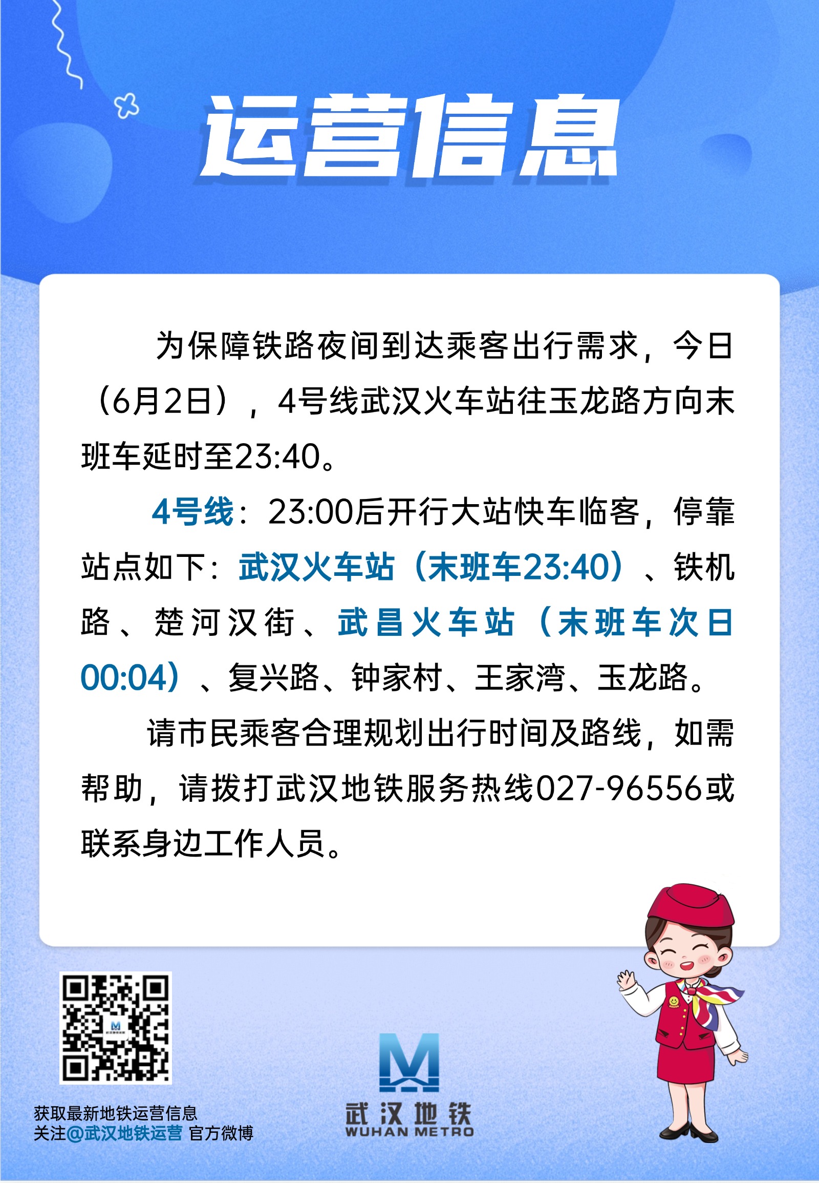为保障铁路夜间到达乘客出行需求,今日(6月2日),4号线武汉火车站往玉龙路方向末班车延时至23:40。