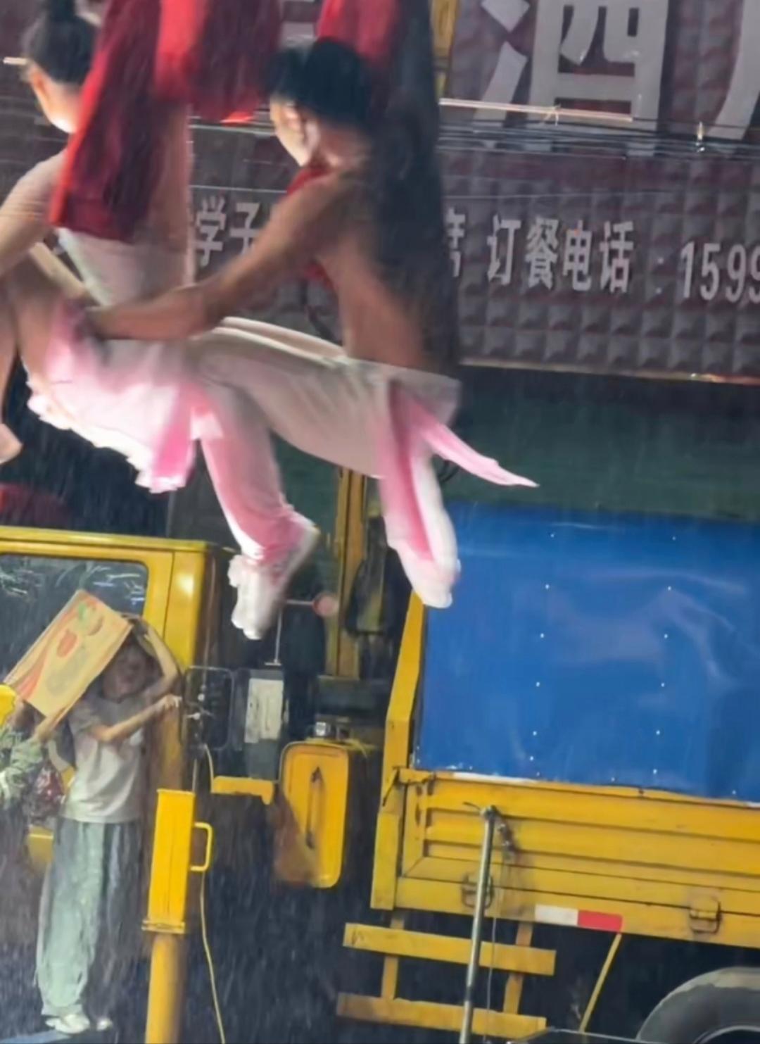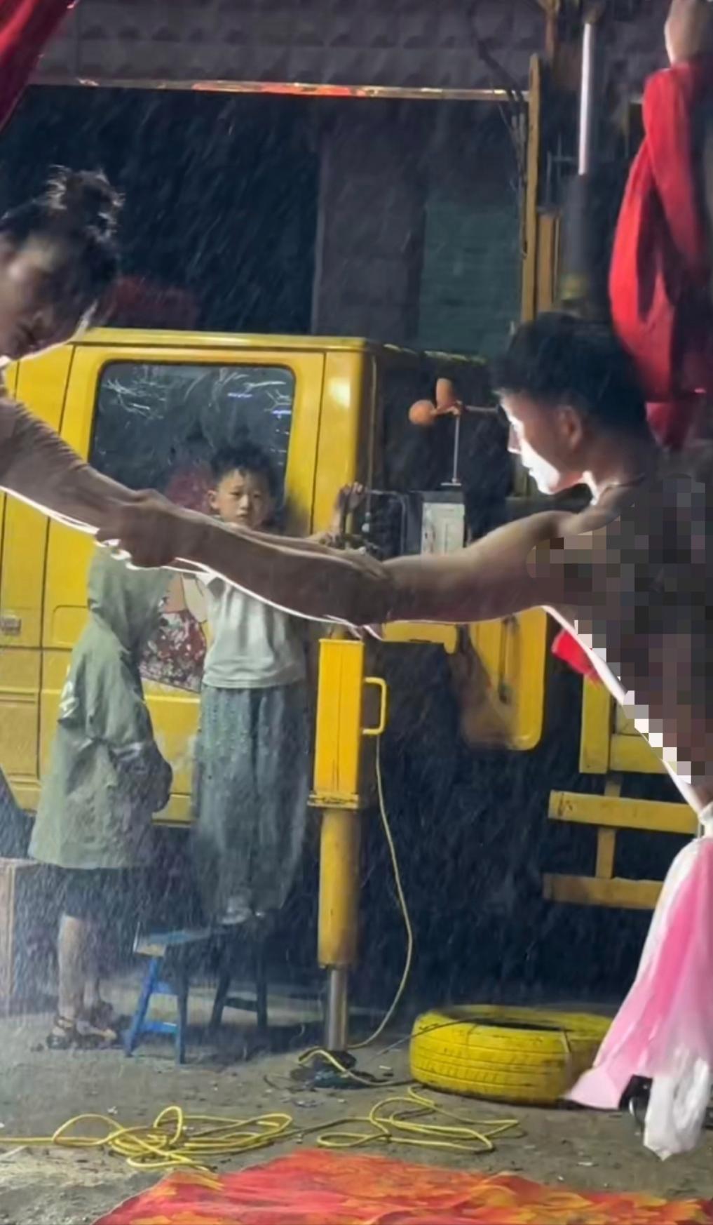 视频显示,男孩在大雨中抓着升降机的手柄,衣着单薄的一对男女演员在雨中升空表演舞蹈。站在男孩旁边的另外一名小孩见状,拿起纸箱盖在男孩头上为男孩遮雨。但男孩怕遮挡视线看不清演员,又将纸箱抬开,一直盯着演员直至他们安全落地。“没看表演光看他了,眼神坚毅,五六岁的年纪成为了父母安全的后盾。”