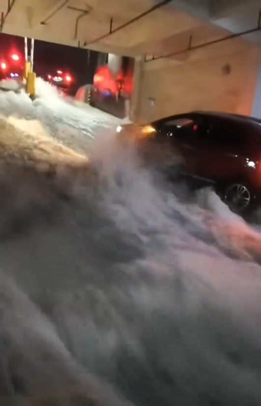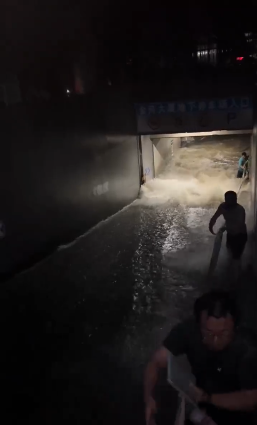 该视频还显示,斜坡下端的车库被涌入的大水淹没,几位男女拉着一根疑似消防用的绳子慢慢往上逃生。