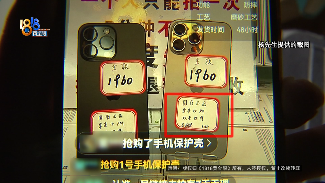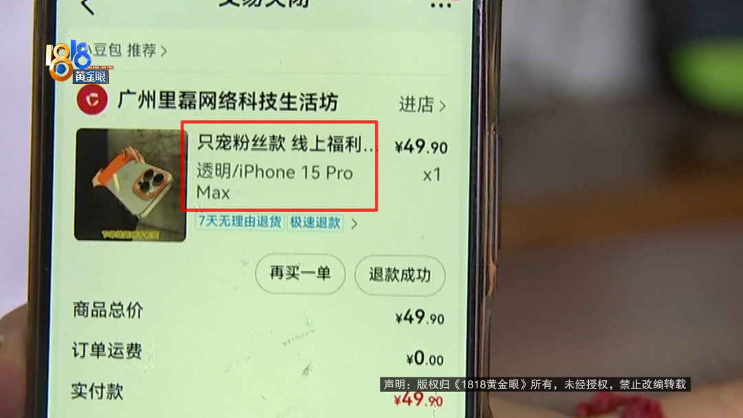 这个订单的金额是四十九块九,商品名称里标注,“只宠粉丝款”,“透明/iPhone 15 Pro Max”,杨先生说是没留意到这些细节。
