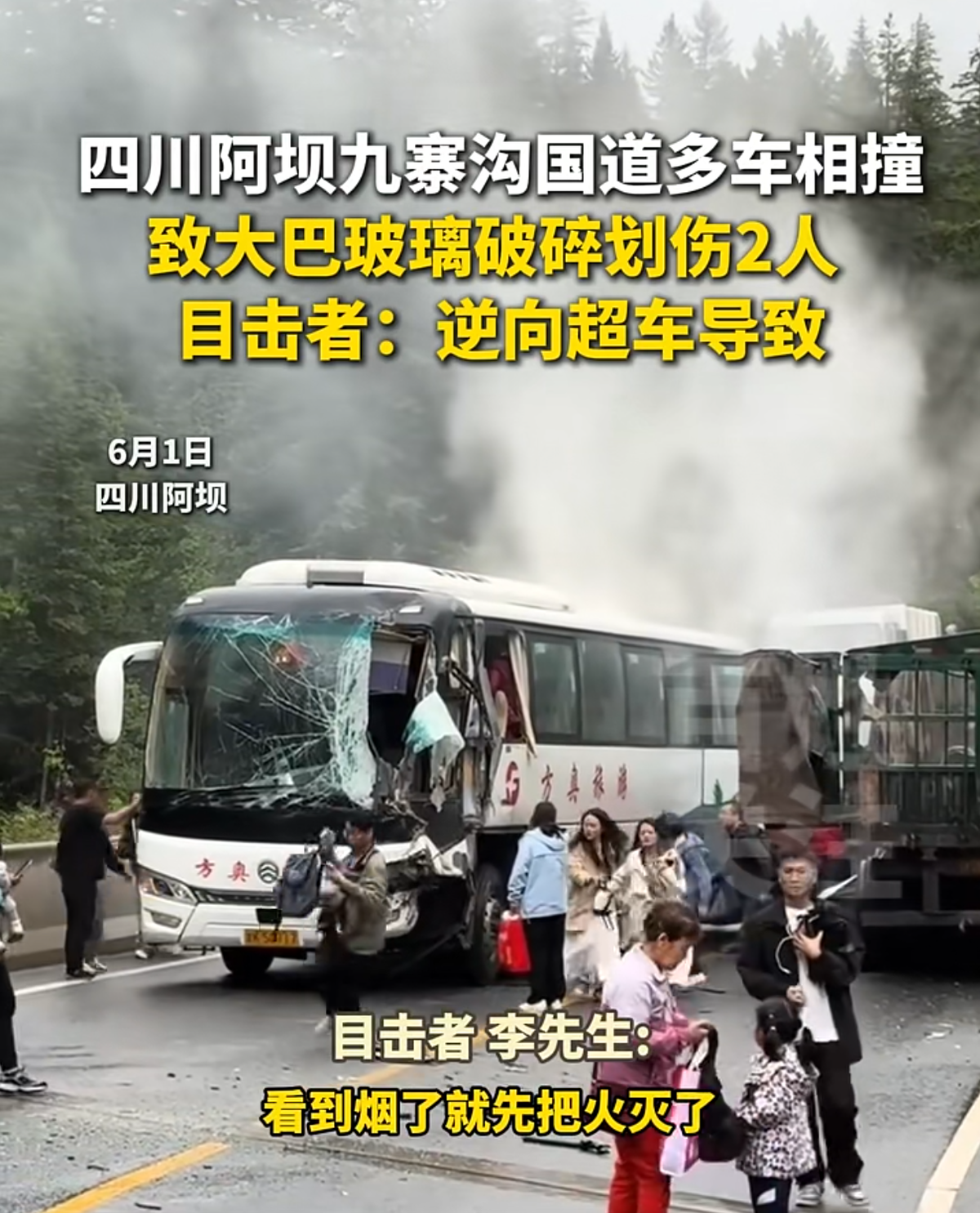6月1日18时许,四川阿坝九寨沟544国道发生多车相撞事故,一辆“方奥旅游”大巴前挡风玻璃右侧损毁。大巴后方不断冒出白烟,车上多名乘客紧急撤离。2日,百姓关注记者联系到目击者李先生,其称事故系一辆黑色轿车逆向超车与大货车碰撞,大货车尾部扫到大巴车前挡风玻璃致其碎裂。