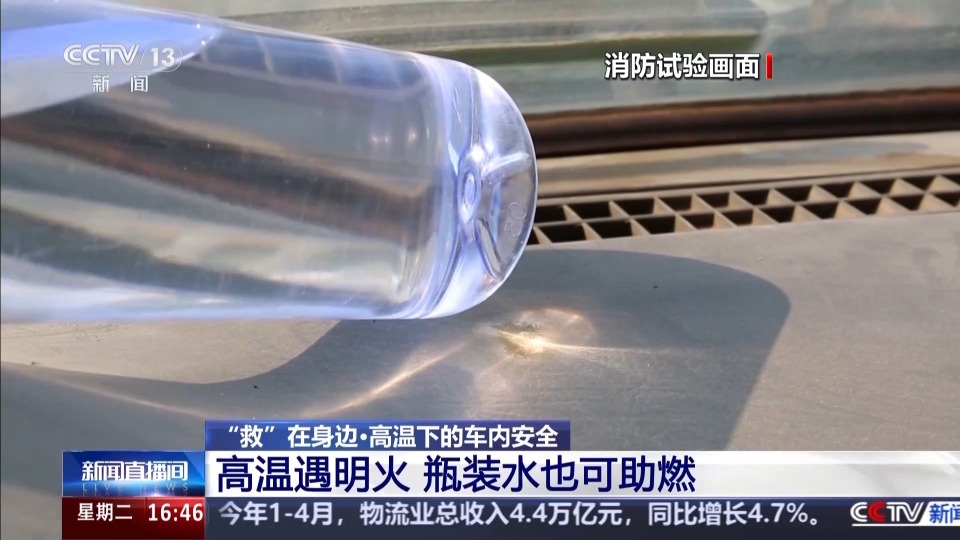 消防员进行了模拟试验,在车外用明火模拟高温环境下引燃除臭剂的情况,可以看到遇到明火后瞬间被引燃。消防员提示,这些气体如果扩散到一个有限的空间里面,很容易形成爆炸性混合气体,发生爆燃的情况,所以高温环境下一定不要将这类物品留在车内。那炎热的高温下,我们在车内饮水再正常不过了,瓶装水随手放置在车内,又会发生什么样的情况呢?