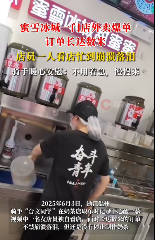 6月3日,浙江温州,骑手“合文同学”在奶茶店取单时记录下心酸一幕,视频中一名女店员独自看店,面对长达数米的订单,不禁崩溃落泪,但还是没有停止制作奶茶,骑手安慰:你慢慢来,不用着急。骑手称,在取餐的时候,小姑娘就已经哭了,他之前已经到过这个店,有半小时了,店里也一直是一个人。