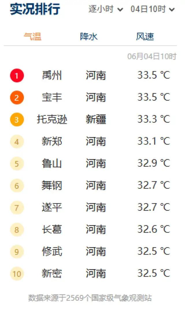 禹州与宝丰以33.5℃的高温并列第一,托克逊为33.3℃位居第三。随后,新郑气温达33.1℃,鲁山气温达32.9℃,舞钢32.7℃,遂平32.7℃,长葛 32.6℃,修武32.5℃,新密32.5℃。