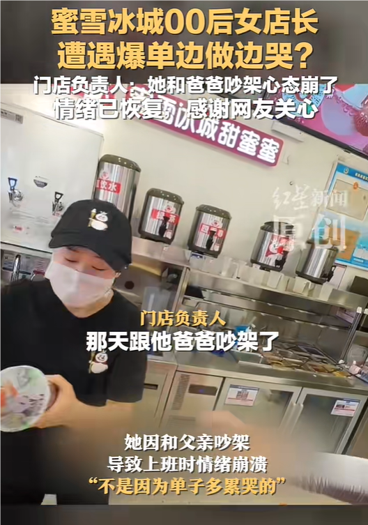 6月4日,红星新闻记者向门店负责人了解到,哭泣的女店员是该店店长,一名00后女孩,昨天她因和父亲吵架导致上班时情绪崩溃,“不是因为单子多累哭的”。该负责人还称,上午10点前的早班,都是排一人班,通常不会像事发当天出现爆单情况,“现在女店长的情绪已恢复,感谢网友的关心”。