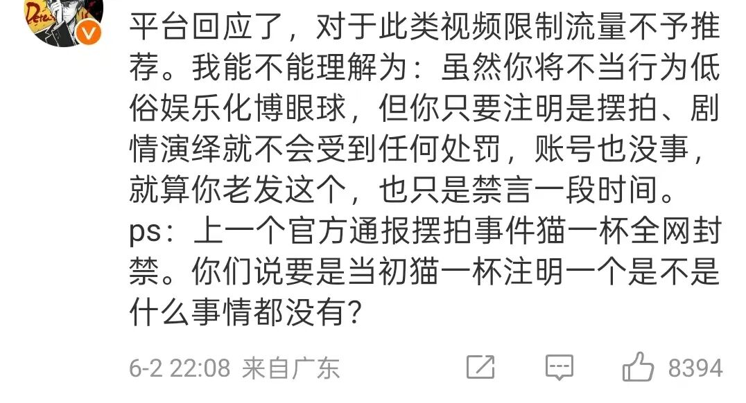 对此处理结果有网友表示:将不当行为低俗娱乐化博眼球,只要注明是摆拍、剧情演绎就不会受到任何处罚,账号也没事就算你老发这个,也只是禁言一段时间。这样的处理是否合理。该行为处理得当?对此潇湘晨报记者联系河南泽槿律师事务所主任付建对此事作出法律解读。