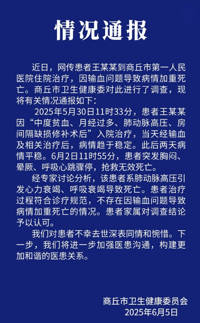 6月5日,据商丘市卫生健康委员会通报:近日,网传患者王某某到商丘市第一人民医院住院治疗,因输血问题导致病情加重死亡。商丘市卫生健康委对此进行了调查,现将有关情况通报如下: