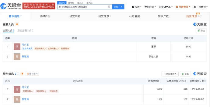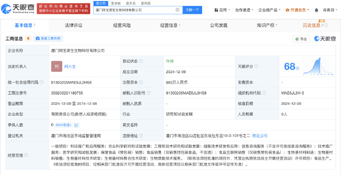 天眼查App显示,何火宝(啊宝)名下关联1家公司,为厦门阿宝源生生物科技有限公司,该公司成立于2024年12月,由何火宝担任法定代表人、董事并持股85%,经营范围包括医学研究和试验发展、保健食品(预包装)销售、食品互联网销售(仅销售预包装食品)等。知识产权信息显示,今年4月,该公司已申请一枚何火宝个人形象图形商标,国际分类为啤酒饮料,当前商标状态为等待实质审查。